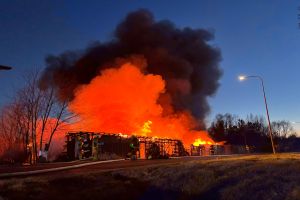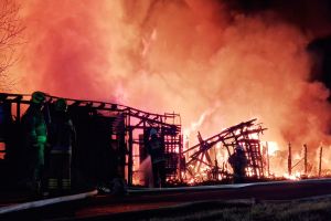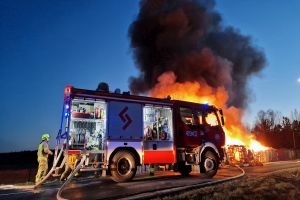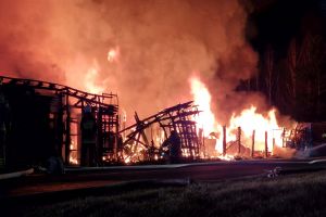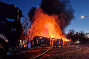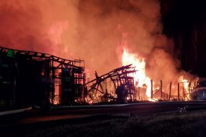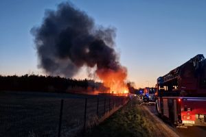W Czersku trwa intensywna akcja gaśnicza związana z dużym pożarem, który wybuchł w budynkach z drewna przy ulicy Wrzosowej (kompleks obiektów w większości o konstrukcji drewnianej - wiaty połączone ze sobą w jedną całość). Na miejscu pracuje wiele jednostek straży pożarnej (na ten moment 18 jednostek, jest też cysterna z Bytowa, dwa zdjęcia poniżej), które walczą z ogniem.