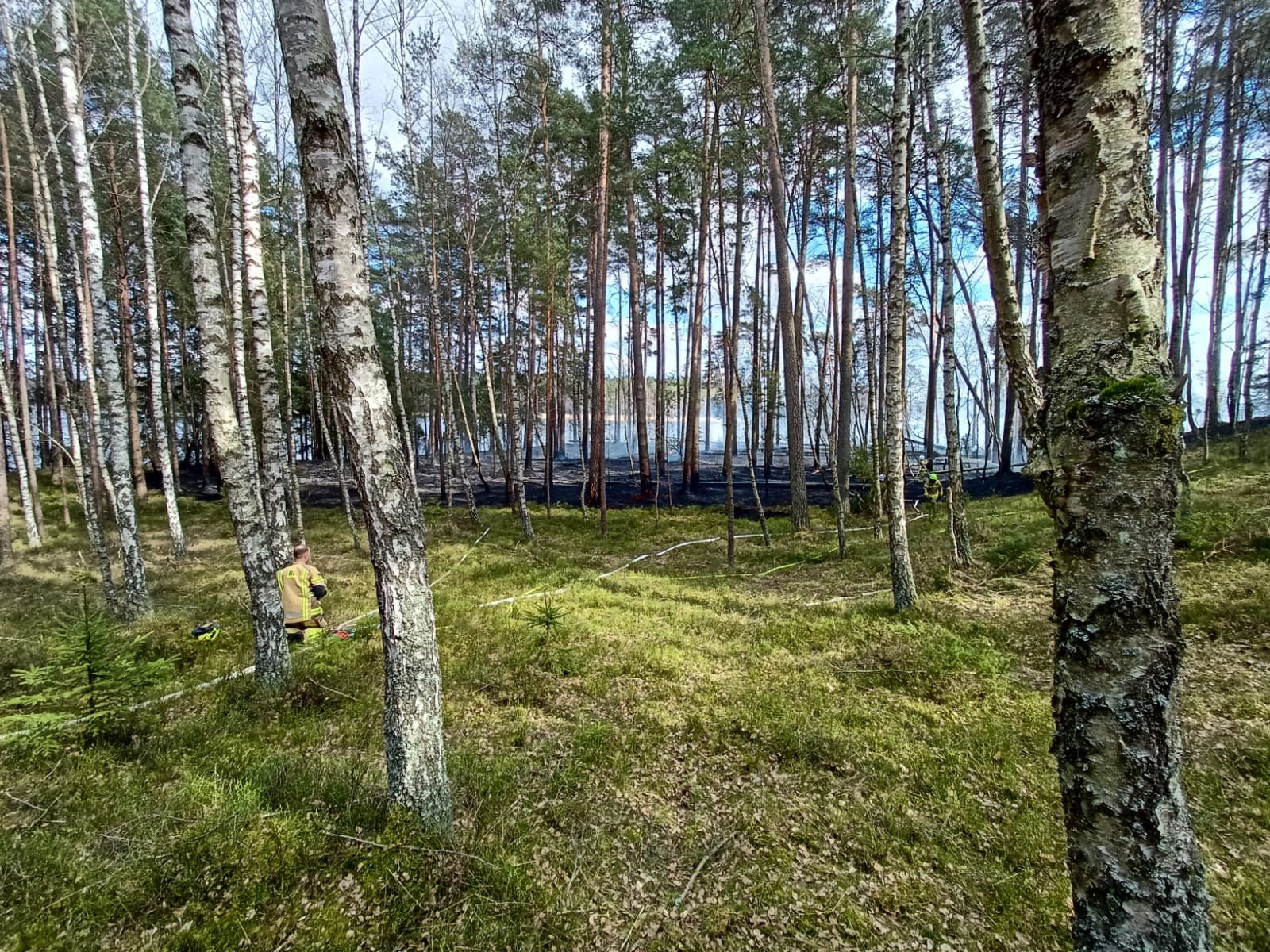 W tym czasie pierwsze zastępy dotarły na miejsce zdarzenia. Był to oddział leśny nr 127, niedaleko osady Józefowo. Po rozpoznaniu ustalono, że pożarem objęty jest obszar około 1 ha ściółki leśnej, traw, krzewów oraz drzew.